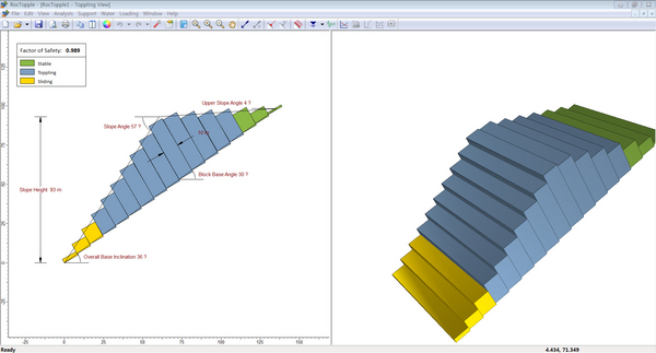 RocTopple은 암반사면 파괴해석 중 전도파괴의 결정론 및 확률론적 한계평형해석 프로그램이며, 전도파괴의 구조해석(한계평형해석)을 실시하여 소요 보강력을 산출합니다.