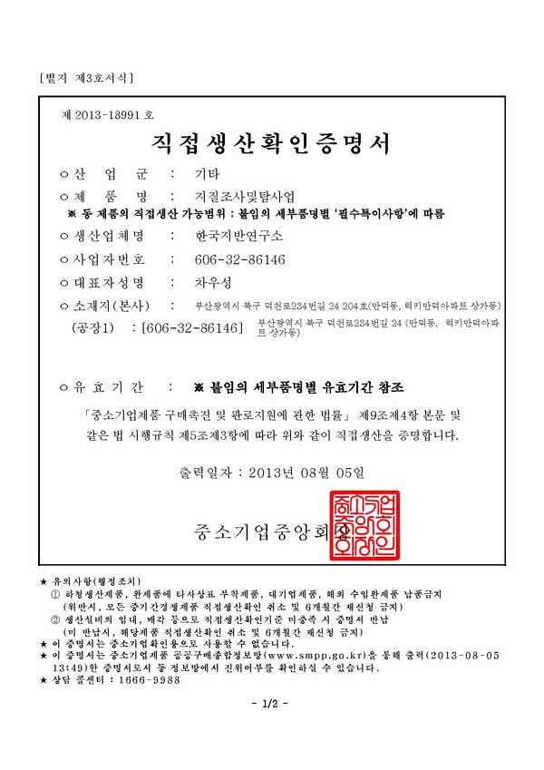 한국지반연구소는 <중소기업제품 구매촉진 및 판로지원에 관한 법률> 제9조 제4항 본문 및 같은 법 시행규칙 제5조 제3항에 따라 직접생산확인증명서를 발급받았습니다.