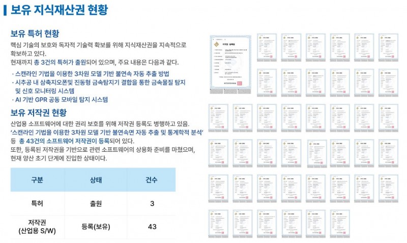 한국지반연구소에서는 스캔라인기법을 이용한 3차원 모델기반 불연속자동추출 방법 외 다수의 특허 및 소프트웨어 저작권(총 46건)을 등록했습니다.