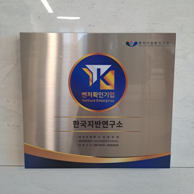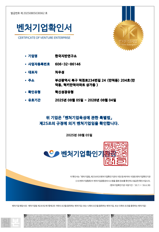 벤처확인기업 선정(혁신성장유형) 페이지 정보 작성자 최고관리자 작성일25-08-11 11:51 조회673회 관련링크 목록 본문 한국지반연구소가 벤처확인기업(혁신성장유형)으로 선정되었습니다.혁신적인 기술로 높은 곳을 향해 나아거 대한민국의 지반정보기술의 미래가 되겠습니다.감사합니다. 목록