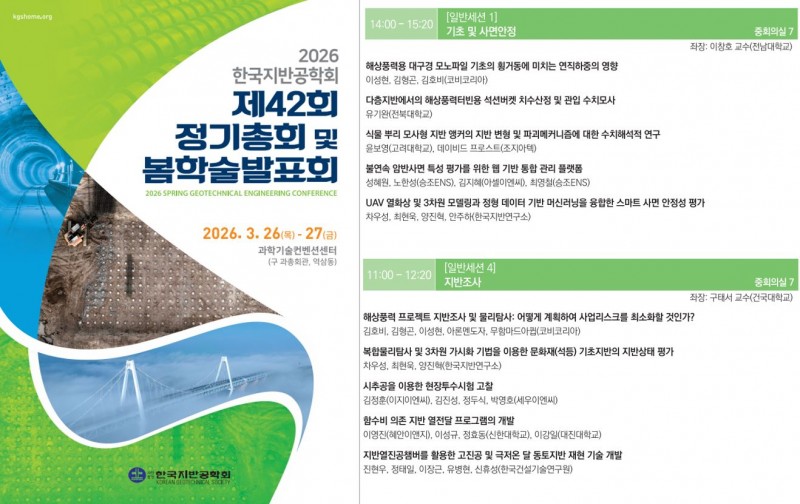 2026년 3월 26일(목) ~ 27일(금), 과학기술컨벤션센터(구 과총회관, 역삼동)에서 개최된 2026 한국지반공학회 제42회 정기총회 및 봄학술발표회에 논문 2편을 발표했습니다.