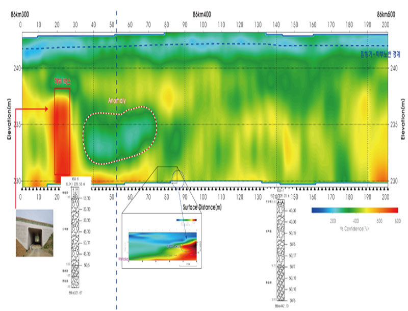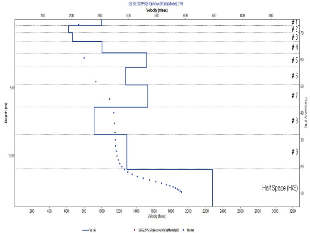 표면파탐사 GPR탐사 탄성파탐사 표면파탐사 전기비저항탐사 전기탐사 자력탐사 전자탐사 다채널 표면파 탐사(MASW) 표면파의 주파수 또는 파장에 의해 그 전파속도가 변하는 분산 특성을 이용하여 지표면상에서 심도 방향 전단파 속도의 분포를 측정하는 탐사(Passive, Active Methods) 탐사구간에 대한 전단파 속도층의 2차원 단면도 작성 가능 역산 후 전단파 속도결과 표면파 탐사 결과