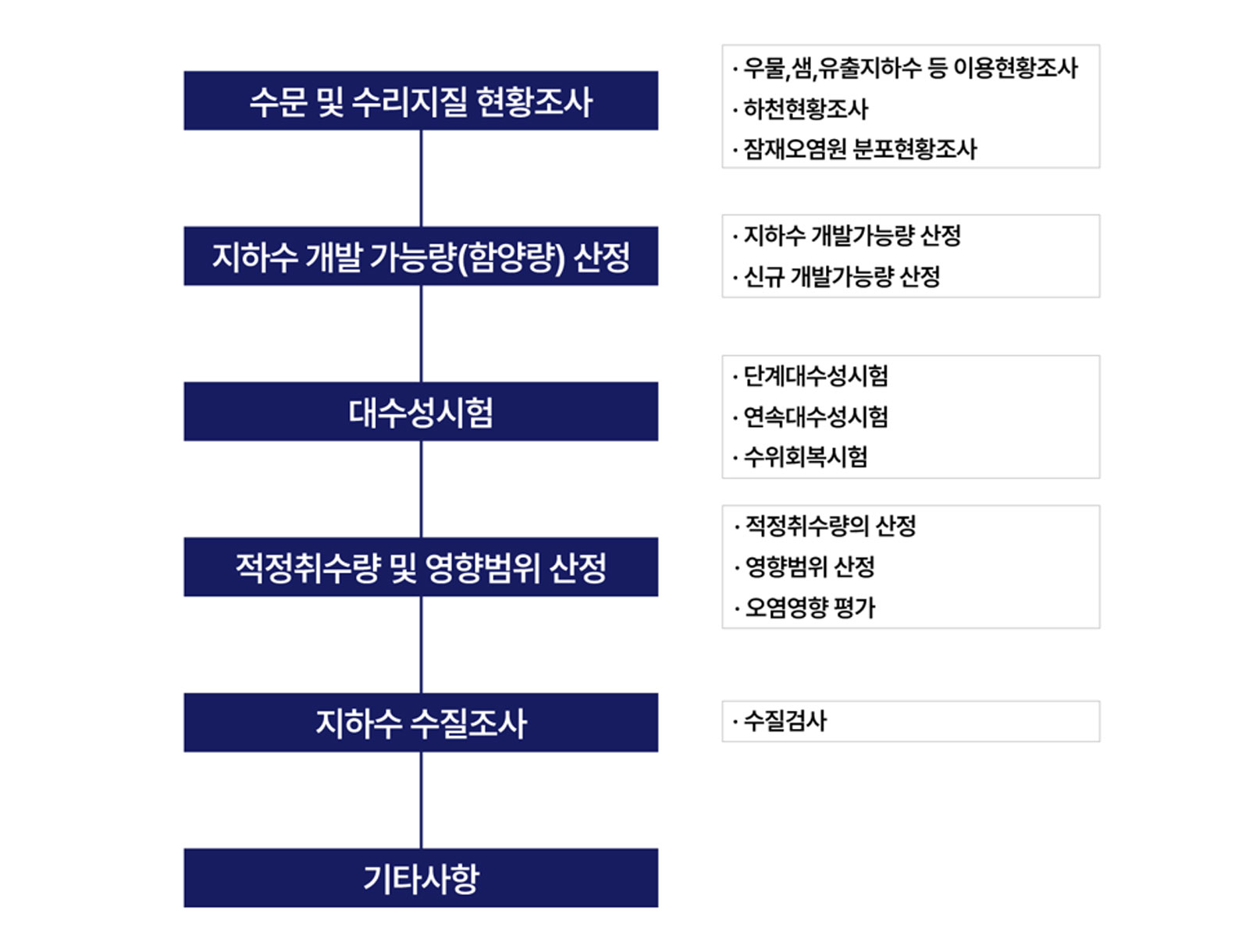 지하수 영향조사 지하수 영향조사 지하수 영향평가 지하수 모델링 지하수 영향조사 지하수 개발, 이용의 허가 시 주변에 미치는 영향을 조사하여 주변 지하수의 고갈과 오염을 예측하고, 이를 사전에 방지함으로써 지하수의 보전과 합리적인 이용을 도모하기 위해 실시 지하수개발, 이용의 허가기준