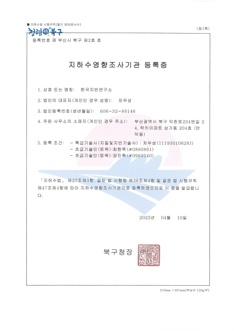 - 2023년 04월 : 지하수영향조사기관 등록