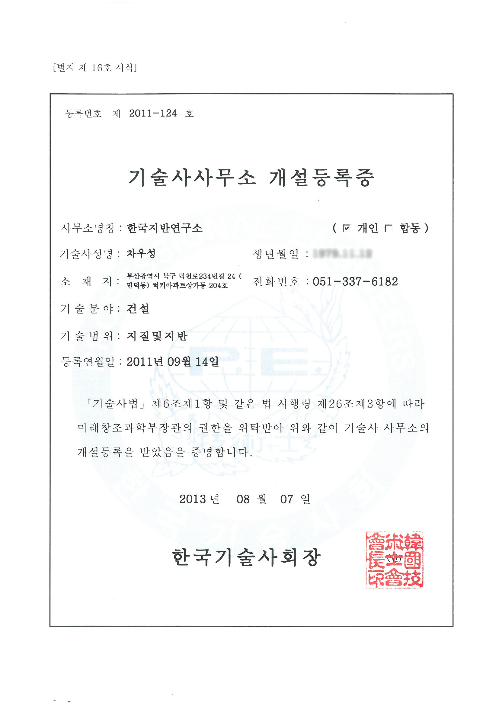- 2011년 09월 : 기술사사무소(지질 및 지반) 개설