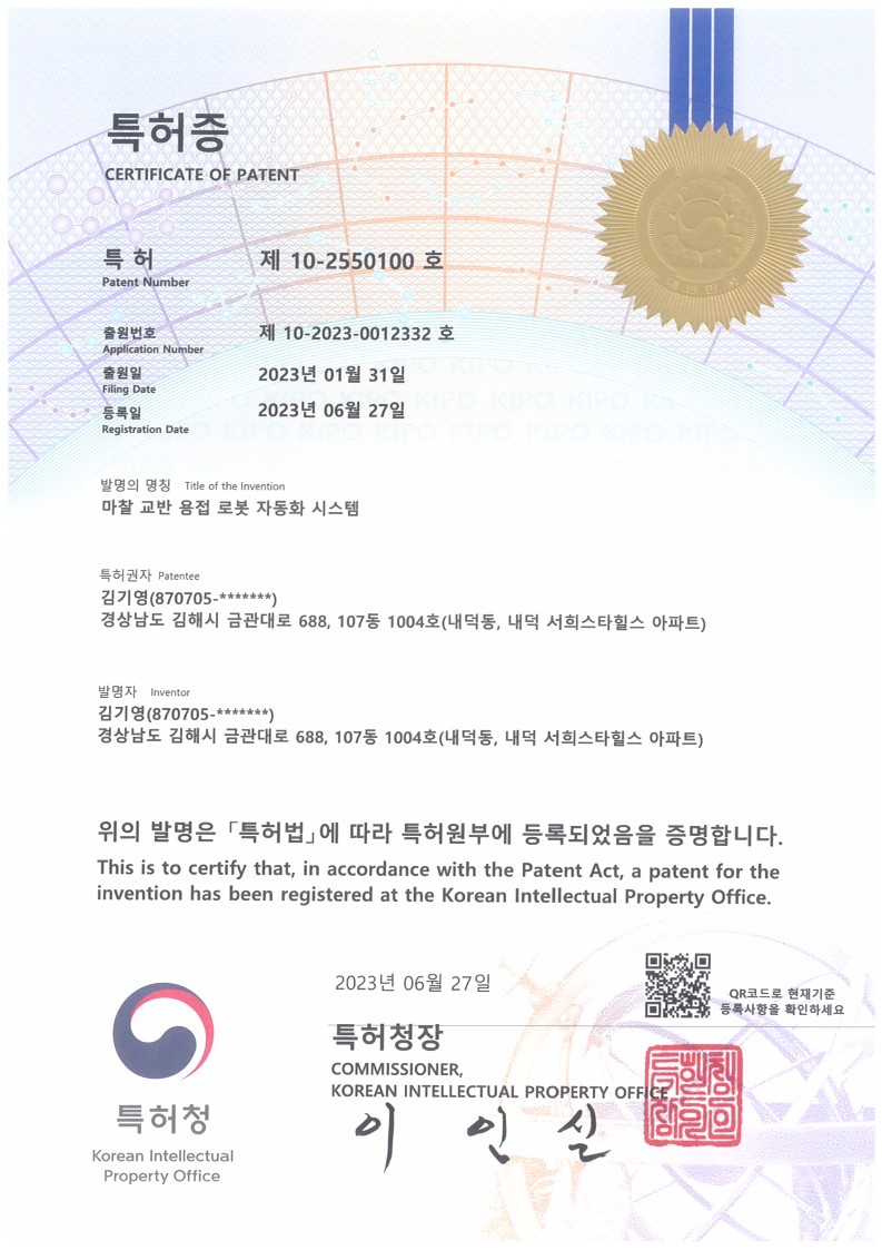 특허증(마찰 교반 용접 로봇 자동화 시스템) 페이지 정보 작성자 운영자 작성일23-07-07 16:13 조회162회 댓글0건 이전글 다음글 목록 답변 본문 특허증(마찰 교반 용접 로봇 자동화 시스템) 이전글 다음글 목록 답변