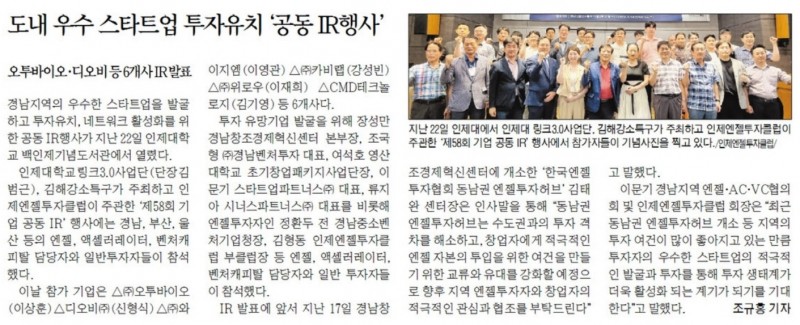 경남 우수 스타트업 투자유치 "공동 IR 행사" 발표 페이지 정보 작성자 최고관리자 작성일23-08-27 18:18 조회929회 관련링크 이전글 다음글 목록 답변 본문 씨엠디테크놀로지 김기영 대표 엔젤투자 IR 투자 설명회 발표경남 지역 신문 기재 이전글 다음글 목록 답변